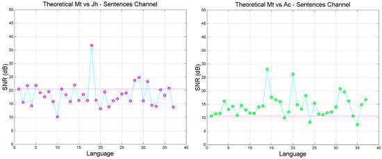 Sentences cross-channel theoretical signal-to-noise-ratio in the indicated languages. Languages are ordered according to Table 1. (Left panel): Matthew versus John; (Right panel): Matthew versus Acts. The magenta line corresponds to Greek (language no.1).