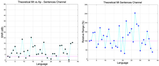 (Left panel): Sentences cross-channel theoretical signal-to-noise-ratio in the indicated languages; Matthew versus Apocalypse. Languages are ordered according to Table 1. (Right panel): Sentences channel relative range (%) in the indicated languages. The magenta line corresponds to Greek (language no.1).