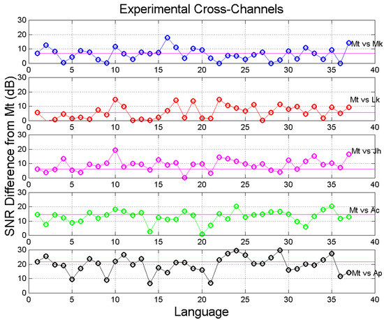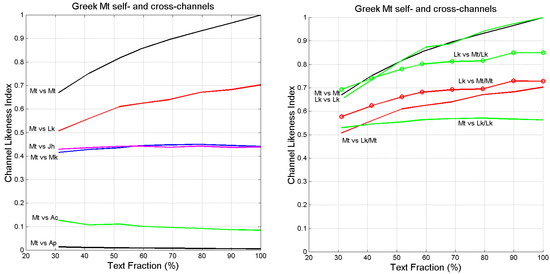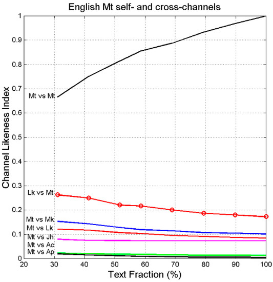 Let us apply the theory to all languages. Figure 4, Figure 5 and Figure 6 show how changes with language when Matthew is compared to Mark, Luke, Acts and Apocalypse (cross channels; color key: blue = Mt vs. Mk; red = Mt vs. Lk; magenta = Mt vs. Jh; green = Mt vs. Ac; black = Mt vs. Ap).