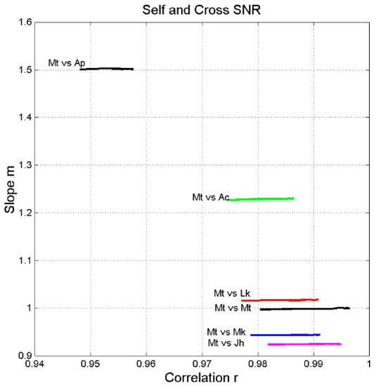 Because we always consider Matthew as dependent text, the data of Table 2 can be used to compare the sentences channel of Matthew with itself (self-channel) and with the other texts (cross-channels). Mathematically, the input data (reference, independent data) to the theory are the slope and the correlation coefficient given, in turn, by Mark (e.g., and , Luke, John, Acts and Apocalypse, and the dependent data are always the values of Matthew, therefore and . Table 3 reports, for each cross-channel, the values of –calculated with Equation (4)-and –calculated with Equation (8)–and the total signal-to-noise ratio calculated with Equations (11) and (12), and the partial values and , calculated with Equations (6), (7), (9) and (10).