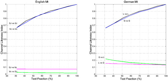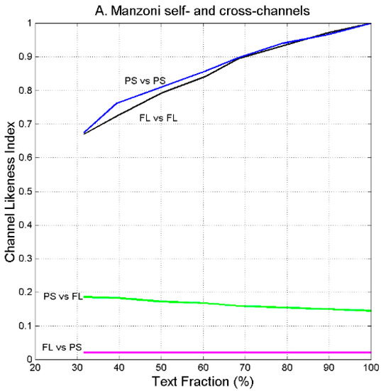 With the extended theory, we can compare two texts by eliminating . In other words, in the example just mentioned, we can compare the number of sentences in any couple of texts-for an equal number of words-by considering not only average relationships, i.e., Equation (1), but also their correlation, Equation (2). We refer to this communication channel as the “sentences channel”.