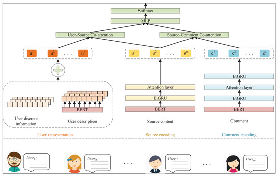 where and are user profile feature vectors and source text feature vectors, respectively, which are learned using co-attention mechanisms. The collaborative attention mechanism between the source text and the user comment is processed in the same manner as the collaborative attention mechanism between the user profiles and the source text, the details are omitted here.