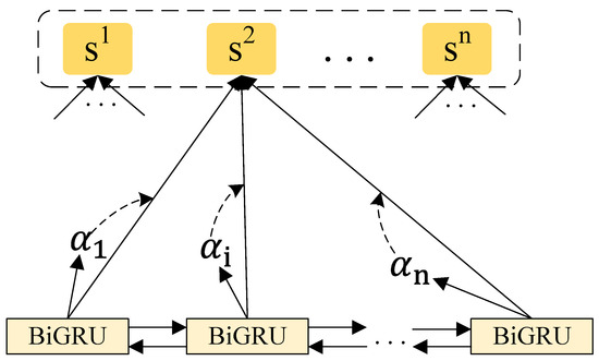 The output of BiGRU is weighted. Different weights are specified so that the model can focus on the key sequence information. The vector representation of the hidden sequence is obtained through the fully connected layer, and then the weight is calculated according to . Finally, the source text vector representing is obtained, and the final source text is represented as .
