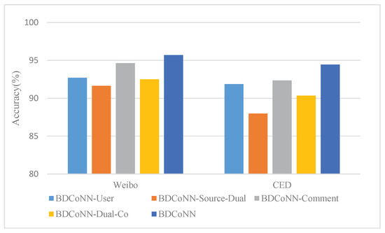 Figure 4 shows the ablation experiment results on two datasets. The results show that after user features are removed, the model is less affected on the CED dataset than that on the Weibo dataset. One of the reasons is that approximately 3% of user data is missing in the CED dataset in the data preprocessing stage, which results in an insufficient contribution to model performance. When the source text encoding module and the dual co-attention module are eliminated, the performance of the model decreases, with a decrease of 4.03% and 6.48% on the Weibo and CED datasets, respectively, which clearly demonstrates the importance of source text for rumor detection. After the dual co-attention module is removed, the reduction in the model performance is the second only to that of BDCoNN-Source-Dual, which indicates that the dual co-attention mechanism makes distance-related semantic information close to each other. It can be used to distinguish the rumor and non-rumor groups, thus improving performance. The experiment on the BDCoNN-Comment module also indicates that the characteristics of comments are of great significance for rumor detection.