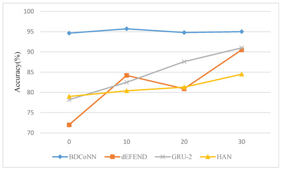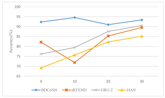 The best scenario for rumor detection is to identify a rumor before the outbreak and reduce its harm. The goal of early rumor detection is to identify a rumor at the initial stage of rumor spreading. To evaluate the effectiveness of BDCoNN in early rumor detection tasks, a new test set is developed, including publishing user profiles, source tweets, and the comments provided by the first 30 people. The experimental results are shown in Figure 5 and Figure 6.
