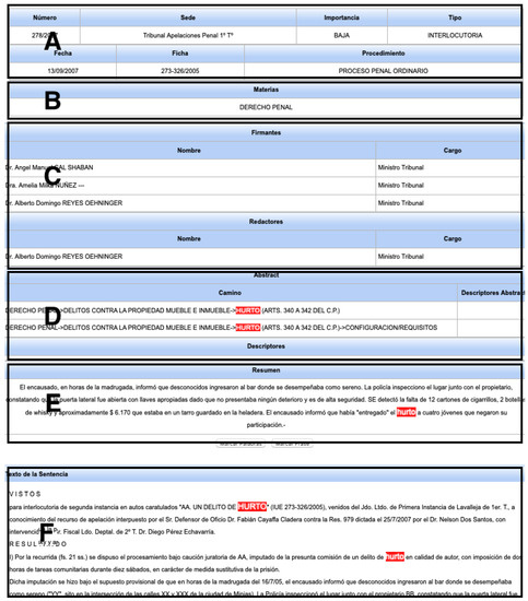 The National Jurisprudence Base’s (NJB) mission is to provide public access to the decisions of the different courts of the Judicial Branch, online and for free. Although formally jurisprudence and customs are not a source of law in our country, they constitute important precedents for all the actors in a judicial process. Since its creation in 2008, rulings from different courts have been systematically added to the NJB, including those from the Supreme Court of Justice (SCJ), the Courts of Appeals and from the Courts of First Instance (the latter still in the process of incorporation). Nowadays, the digital legal database has around 80,000 documents, publicly available on an Internet portal (http://bjn.poderjudicial.gub.uy, 12 December 2021). In Figure 1, we show an example of a document provided by the NJB portal.