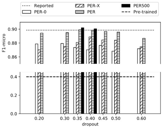In Figure 3, we can see the F1-micro scores obtained with (a) label “PER-X” without resetting the NER module (PER-X), (b) label “PER” resetting (PER-0) and (c) without resetting (PER) the SpaCy NER module. “PER” experiments always achieved the best results, no matter the dropout rate selected. The best F1-micro scores are obtained for 0.35 and 0.40 dropout rates: 0.8991 and 0.8983 in 80 and 75 iterations, respectively. These values are an improvement of 0.50 points over the 0.3999 F1-micro score obtained with the model before retraining and are at the same level as the original reported 0.8986 F1-micro score. All models are trained until there is no improvement detected over the training set for 20 rounds, with a minimum training of 120 epochs.