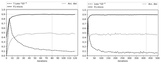 Following our stopping criteria, 20 rounds without performance improvement, the best results are always obtained way before 500 in all previous experiments. As a final experiment, we trained the two best configurations for 500 epochs: “PER” label with 0.35 and 0.40 dropout rates, without resetting the NER module pre-trained values. The results obtained an F1-micro score that reaches up to 0.9021 (+0.003) and 0.9005 (+0.0022) in 420 and 185 epochs, respectively, slightly over the 0.8986 F1-micro score reported by the authors for the original model. Figure 4 shows these experiments for the 0.35 dropout rate. It can be seen that the models adjust very quickly and the gain starts to become marginal after around 100 iterations.
