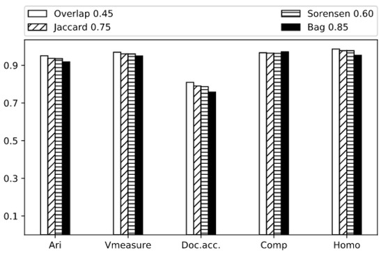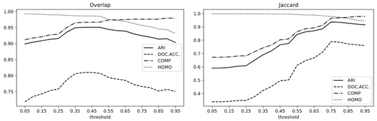 In Figure 5, Completitude, Homogeneity, ARI and Document Accuracy are shown for Overlap and Jaccard by threshold value; the best ARI scores are obtained at thresholds 0.45 and 0.75, respectively, and therefore, Overlap-0.45 and Jaccard-0.75 are our best solutions for those distances. In Figure 6, the ARI performance of our top four measures variation values of distance threshold is depicted.