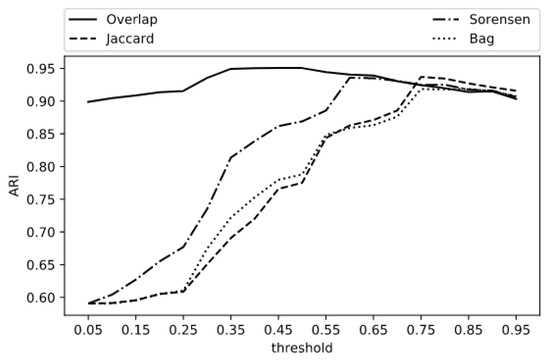 ARI for Overlap, Jaccard, Sorensen and Bag by threshold value.