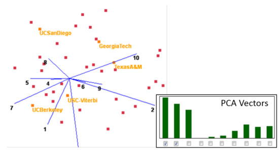 The late Jim Cray [1] described data-driven science as the evolution from hypotheses to patterns, and the most interesting and useful data patterns involve many more than just two variables. They are High-dimensional (N-D), as opposed to bivariate. Unfortunately, High-dimensional patterns are fragile structures that do not always survive the mapping from N-D space to the 2-D (or even 3-D) space in which the human visual system operates and can visualize them. Let us demonstrate this by way of a simple example, using a 10-D dataset composed of a set of colleges with salient attributes such as US-News score, tuition, athletics, housing quality, etc. Figure 1 shows a High-dimensional scatterplot (a biplot) of this college dataset. Focusing on dimension 10, tuition, in the upper-right portion of the figure, we observe that, while USC-Viterbi is an expensive school, it ends up located to the left of the cheaper Texas A&M. This is a well-known phenomenon because biplots use the two most dominant Principal Component (PCA) vectors as a basis and project both data and dimension vectors into it. However, as the PCA bar chart shows, there are in fact three significant PCA vectors, and some less significant ones. The visualization only coveys the variance of the two major PCA vectors; the remaining unexplained variance leads to this distortion. These types of distortions occur with any projective N-D to 2-D mapping, linear or non-linear, in all but the most trivial cases. They affect individual point-pair relations as well as overall cluster appearance, such as density, composition, shape, and organization.