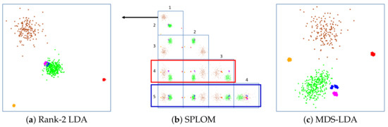 Figure 2a shows a scatterplot obtained by Rank-2 LDA with an artificial Gaussian dataset, consisting of six well-separated clusters in 30-D space that are composed of 200, 200, 300, 360, 450 and 150 points, respectively. Figure 2a shows that the clustering is well preserved by Rank-2 LDA. However, three clusters—magenta, blue and green—are overplotted. Figure 2b visualizes all possible sets for Selected-2 LDA using a SPLOM. We observe that if we use the fourth dimension (scatterplots within the red box), the green cluster is no longer mixed, but the blue and magenta clusters still are. On the other hand, if we use the fifth dimension (blue box), the blue and magenta clusters are separated, but they both mix with the green cluster. Hence, the Selected-2 LDA method [13] can indeed reduce the overplotting problem but cannot totally eliminate it.