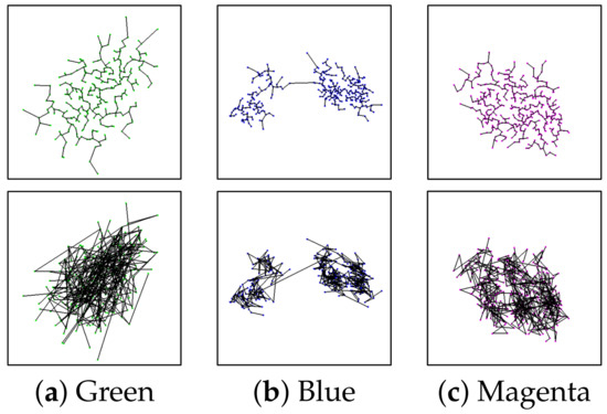 As argued in the introduction, cluster patterns (intra-cluster distances) are typically not well-preserved when mapping them from N-D to 2-D. It is easy to demonstrate that the N-D patterns are not preserved in the 2-D projection by inspecting the MSTs generated using both N-D and 2-D distance. Figure 3 shows the three clusters in the MDS-LDA plot with a 2-D distance-based MST on the top and an N-D distance-based MST in the bottom. In all three clusters, the two MSTs look dissimilar. This dissimilarity demonstrates that distortion is introduced by the dimension reduction and causes a change in the N-D patterns when projected to 2-D.
