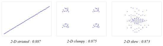 2-D example scatterplots for each metric we have encoded. For each of them we chose a high value level for better illustration of their real-world graphical appearance.