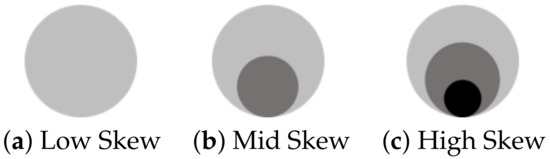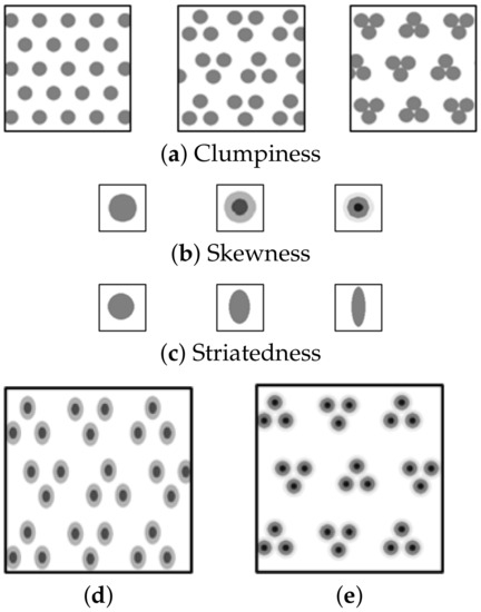 As mentioned, we bin the metric values into three levels: low, mid, and high. As part of pre-processing, the system procedurally generates a set of 27 repeating textures: the three Scagnostics metrics with three levels each (low, medium, high). In each texture, a set of points is abstracted as a triad of blobs which communicate all three metrics. The clumpy value is communicated by varying the space between the blobs in a triad, in which a small inter-blob distance indicates high clumpiness and greater distances indicate lower clumpiness (Figure 6a). The skew value is shown as one, two, or three concentric rings that represent, respectively, low, medium and high skew (Figure 6b). The striated value is visualized by stretching the blobs, where a circular blob indicates a low striated value and an elongated blob indicates a high striated value (Figure 6c). Figure 6d,e show two examples of synthesized textures that combine these three metrics.