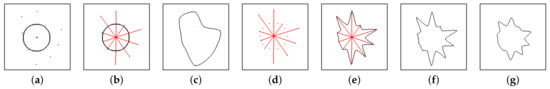 Glyph generation of a 10-D cluster. (a) Boundary points representing each dimension. (b) Visualization of variances of dimensions (red lines from the center). (c) Boundary generated by points in (a). (d) Insertion of intermediate points with length of local minimum standard deviation (SD) from the center between every pair of the initial boundary points. (e,f) Boundary generated by points in (d)—it visualizes the heterogeneous shape much better. (g) Boundary generated by smaller maximum radius.