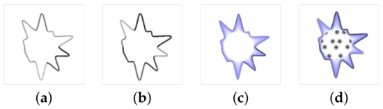 Boundary shape: If a cluster has similar SDs across all dimensions, the N-D shape of the cluster can be considered homogeneous, otherwise it is heterogeneous. Figure 7 illustrates the design process of the glyph boundary shape. Figure 7a shows 10 boundary points of the glyph to visualize a 10-D cluster. Each point corresponds to a dimension in clockwise order. It has an inner circle to secure an area for the appearance texture. The radius of the inner circle (in black) represents a global minimum SD along all dimensions of all clusters. Figure 7b shows how the boundary points are computed. The length of a red line represents the magnitude of the SD in the corresponding dimension and is normalized by a global maximum SD along all dimensions of all clusters. The boundary is created by connecting the boundary points. Since this list of points often yields a rather noisy boundary we smooth the set of points by applying an interpolating cubic spline that loses no information (Figure 7c). As seen, the SDs have variation—some of them are close to the minimum SD but some of them are much larger than it. However, due to the similar magnitude of SDs in the 2nd–5th and 6th–8th dimensions, it is difficult to notice the variation of SDs, i.e., the heterogeneous shape. We found that the heterogeneous shape is hard to recognize when there are consecutive dimensions with similar SDs. Therefore, intermediate points (red points in Figure 7d) are inserted between the boundary points to minimize the influence of such consecutive dimensions. These intermediate points are computed by a local minimum SD along the SDs of all dimensions of the cluster. Figure 7e shows that the boundary including the intermediate points visualizes the heterogeneous shape much better. Figure 7f,g show two different cases by setting different lengths for the global maximum SD, but the same length for the global minimum SD. The boundary is generated with a shorter length for the global maximum SD in Figure 7g. Our system allows the circle radius and the length for the global maximum and minimum SD be controlled interactively.