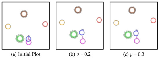 We modified the algorithm by Gansner and Hu in the following way. Their original scheme uses a bounding box for a node to check for overlaps. If we used a bounding box, however, it may detect “fake” overlaps which actually do not exist because our primitives are largely circular. So, by substituting the half width and half height of a node (cluster) with the radius of the glyph, i.e., the local maximum radius, we can alleviate the problem. Furthermore, since a glyph is generated by different radii according to the SDs, using the maximum radius may still give rise to fake overlaps. We thus provide a slider interface by which users can control how much partial overlap is allowed, called the permitted overlap ratiop. If , the radius can be substituted with when computing the overlap factor. By allowing for interactivity in the iterative overlap algorithm, users can control the variation of the layout. By observing the intermediate results from each iteration, users can decide if another iteration is needed or not and so run less risk of destroying the initial layout significantly. Figure 9 shows how our improved method reduces the overlaps according to p.