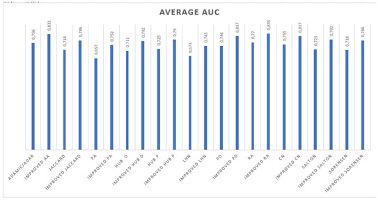 According to the results of Figure 2, we notice that for all algorithms, the improved version has a higher AUC average than the existing metrics. For the preferential attachment metric, the improved AP is superior by . We can draw the same conclusion for the rest of metrics.