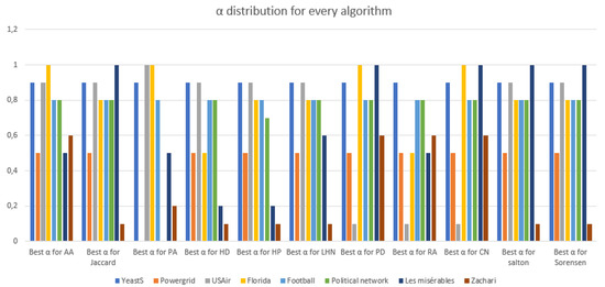 The first one contains the edges of E, the second one contains randomly chosen edges from . Then, we attribute a null value to the edges from and 1 to those of E. We split them into test set and training set where the . Finally, we train our classifier on the training set and then predict the test set. We use the Sklearn framework [45] to apply machine learning algorithms. Note that we use the best of the improved RA for each dataset (see Figure 3).