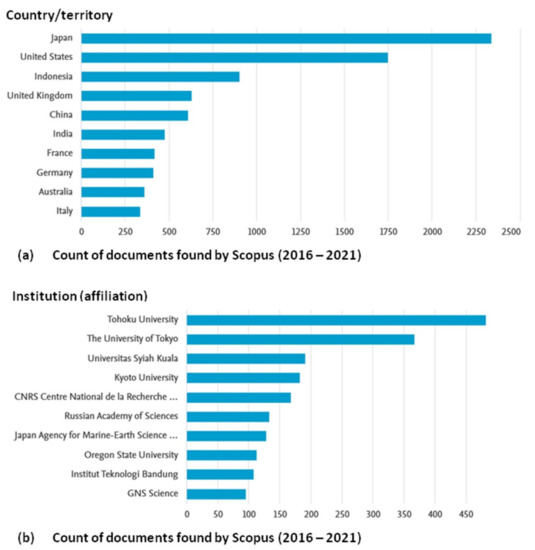 Visualisation of statistics about tsunami-related documents (Scopus search 2016–2021). (a) Found documents in the Scopus by country/territory. (b) Found documents in Scopus by an institution.