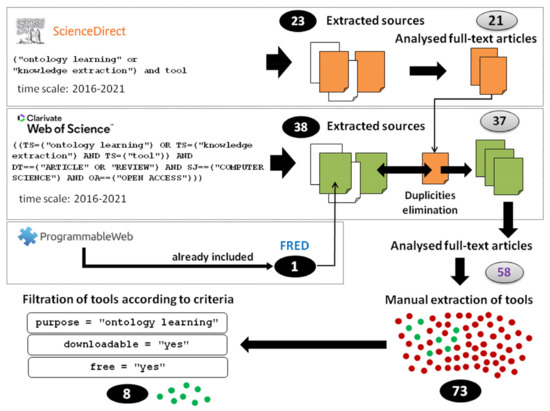 Figure 2 depicts how the final set of tools was obtained. Three sources are used for discovering tools for ontology learning: ScienceDirect scientific database (https://www.sciencedirect.com/, accessed on 10 October 2021), Web of Science scientific database (WOS) (https://www.webofscience.com/wos/woscc/basic-search, accessed on 10 October 2021), and ProgrammableWeb website (https://www.programmableweb.com/, accessed on 10 October 2021). ScienceDirect and WOS contain prestigious and high-quality journals. Full versions of the computer science-related articles of these journals are freely available to the authors of the paper in the majority of cases. These databases are used for reviewing papers that mention ontology learning tools while solving specific problems. Two search criteria are specified for searching in the ScienceDirect: (a) search terms: (“ontology learning” or “knowledge extraction”) and tool, (b) considered time scale: 2016–2021. Search query in case of the WOS has the following structure where the same search terms and time scale is considered: ((TS = (“ontology learning”) OR TS = (“knowledge extraction”) AND TS = (“tool”)) AND (PY = (“2021” OR “2020” OR “2019” OR “2018” OR “2017” OR “2016”) AND DT = (“article” OR “review”) AND SJ = (“computer science”) AND OA = (“open access”))).
