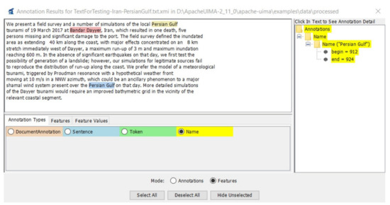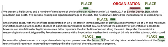 It is obvious that a large spectrum of text mining-related activities are used for information and knowledge extraction from texts. The aim of the paper is not to find the best tool for each of these text mining tasks, but it is to select a particular subset of tasks with respect to the needs of authors of the paper and to verify whether these tasks are provided by the tools. This subset of tasks (requirements) is presented in more details in the third and fourth sections of the paper. The tools are investigated with respect to the main interest of the authors—to automate the processing of a large collection of texts related to the tsunami research. This is the reason why a short piece of text focused on disaster management (tsunami event) is used to evaluate the tools. As a brief explanation, a tsunami is a series of long ocean waves which can be caused by earthquakes, volcanic eruptions, (submarine, onshore) landslides, or pressure disturbances in the air (a meteotsunami). Consequences of tsunami occurrence can be devastating. A mega-tsunami can damage coastlines and sweep vegetation with human habitations in a matter of seconds [8,9]. Not all tsunamis have such a hazardous impact. Some of them are only detected by sensitive instruments on the ocean floor (a micro-tsunami) [10]. It is clear that tsunami preparedness is crucial for survival.