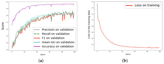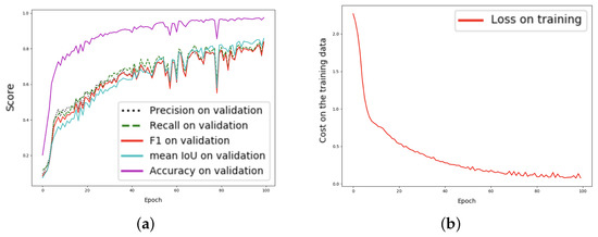 Graph (learning curves) of the Road Asset corpus of the baseline approach, “YOLOv5L”; x refers to epochs, and y refers to different measures (a) Plot of model loss (cross-entropy) on training and validation corpora; (b) performance plot on the validation corpus.