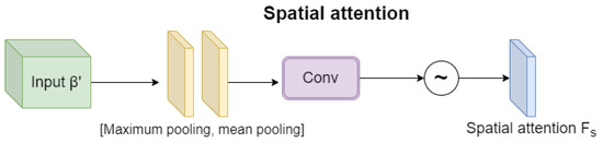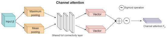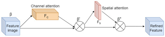 CBAM [16] is composed of a one-dimensional channel attention module and a two-dimensional spatial attention module , which are arranged in series, as shown in Figure 4. The image features are first input into the channel attention module, and the channel features are generated using the channel relations of the features . Then, the generated features go through the spatial attention module to obtain the final features . The channel attention module retains more image texture information and detailed semantic information, while the spatial attention module extracts effective spatial features by focusing on the contour and spatial structure of the image. The calculation formula of is as follows:
