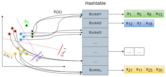 Since the image features extracted in this paper are a large number of high latitude features, this paper projects the high latitude features into the multi-dimensional space, and each dimension represents a basic feature. However, it is very complicated to project K feature vectors in the high dimensional space with n features. Therefore, the feature vectors are projected into the m-dimensional space using the random projection method, where , while maintaining the same cosine distance. Firstly, this paper divides the original data space with a random hyperplane. After each data is projected, it will fall into one side of the hyperplane. After multiple random hyperplane partitions, the original space is divided into many cells, and the data in each cell is considered likely to be adjacent, then, hashes the data in each cell into the corresponding slot through the hash function to form a hash table. In a hash table, different numbers of buckets and their corresponding feature vectors may be created. Figure 8 shows LSH using the random projection method to create a set of hash tables to build an index. For example, are similar feature vectors that are divided into the same slot.