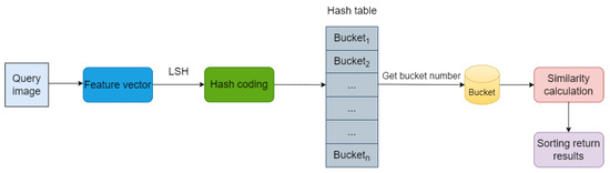 The query image is first input into the network, and the feature vector is produced after the feature extraction model, and then the feature vector is encoded and hashed into the homologous hash bucket of the hash table employing the LSH algorithm random projection, and the corresponding bucket number is obtained. Then, the corresponding data in the bucket number is taken out, the distance between the query image to be retrieved and these data is calculated, and the most similar n data are returned. The search process is shown in Figure 9.