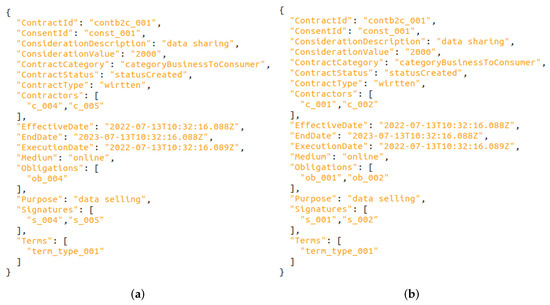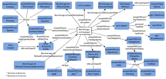 To cover both UC1 and UC2, we have reused fibo-fnd-agr-ctr:MutualContractualAgreement from FIBO [36], which is generic enough to cover both use cases. A mutual contractual agreement involves an exchange of promises in which the promises made by each party represent considerations supporting the promises of the other party. Two categories of contracts have been modelled—smashHitCore:BusinessToBusiness and smashHitCore:BusinessToConsumer—according to UC1 and UC2.