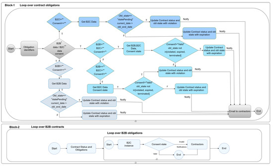 Figure 4 is divided into two blocks, namely block-1 and block-2. Block-1 shows the following three scenarios used to perform CCV: (i) B2C contract; (ii) B2B contract; (iii) Consent-based B2C and B2B contract. While in block-2, we show the CCV with the fourth scenario (i.e., automatic detection of contract breaches based on informed consent, where the consent has expired and the contracts—based on that consent—are still running). In smashHit, a B2C contract is created between an insurer (acts as a data subject) and LexisNexis (acts as a data controller). While a B2B contract is made between LexisNexis (acts as a data controller) and an organisation (as a data processor). To make a clear distinction among all four scenarios, we assigned different colours to scenarios. In block-1, the B2C contract scenario is presented in baby blue colour, the B2B contract scenario is in iceberg colour, and the informed-consent base contract scenario is in fresh air colour. Alice blue colour is assigned to present the fourth scenario of the CCV in block-2. In the following subsections, we present each of them in more detail.
