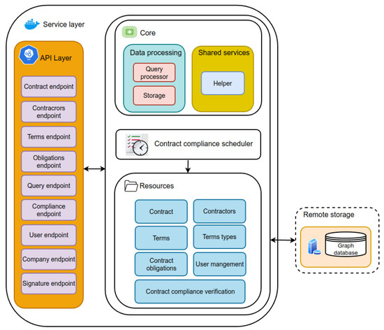 Figure 5 presents the CCV architectural design. It follows a micro-services architecture pattern. A micro-services architecture pattern is one in which all modules are cohesive, independent processes that interact through messages [48]. The Service Layer is a key component, which comprises the Core, the Resources, the Application Programming Interface (API) Layer, and the contract compliance scheduler. We describe each of them in the following subsections.