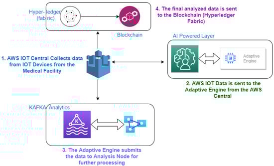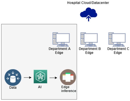 Edge computing is now being reinvented with technologies such as IoT and AI, which bring added value to healthcare outcomes, thus reducing workloads and optimizing networks and services to improve health outcomes. In the new data era, the dependence on internet-connected medical devices will be increasing, hence making edge computing a key technology for healthcare systems. Figure 10 below represents various departments in the hospital/healthcare unit comprising their own edge gateways. These devices are small computational units, which are capable of performing a certain specific task and streaming the information on the Internet. They can be called IoMT devices at the edge gateway. From various departments, information goes to the hospital cloud or data centre. This information is analyzed with the power of artificial intelligence to give the edge-level inferences and results. This accounts for the first layer of execution in the proposed model in this study. There can be several other departments as well, which can share the information related to a patient disease or analysis. All the information collectively comprising of a registered patient ID is submitted from registered devices. It becomes the duty of the edge gateway to assure that the information submitted from each and every machine for a particular patient ID is in a proper format and ready to be analyzed with the help of the adaptive artificial intelligent analysis engine.