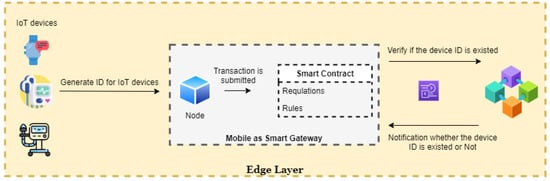 The registration of the device is executed and processed further. Once the process of device registration is executed and the transaction for this execution is noted inside the Ledger, a new block is generated with the help of the blockchain that comprises the device identification along with the hash value. The sensors, which are registered with this network, are also provided unique identification numbers. Once these identification numbers are propagated in the blockchain, the complete system across the decentralized P2P network is notified. A representation of the registration process at the edge layer is depicted in the Figure 3 above.