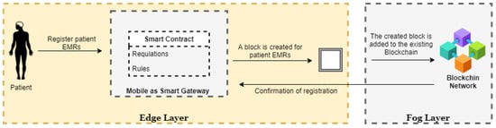 For the bigger data that need more computation, which cannot be processed at the edge layer, the decision-making will move up to the Fog layer as data processing requires a higher level, a high-performance computer that acts as a smart gateway to blockchain in the upper layer. We have already discussed above that, due to the small size and limited functionality of the sensor-based IoT devices, their computational power, along with memory storage, is limited [22]. Thus, each patient will have a blockchain so that all the patient’s IoT data will be integrated into the patient’s own blockchain. The gateway in the fog layer is responsible for access to part of the sensors as per Figure 8 below. The network layer is responsible for storing all the transactions that take place in the blockchain. The selection of the main node and the broadcasting of information to all the peer nodes in the P2P network is handled with the help of the network layer to provide the complete functionality in the Ledger.