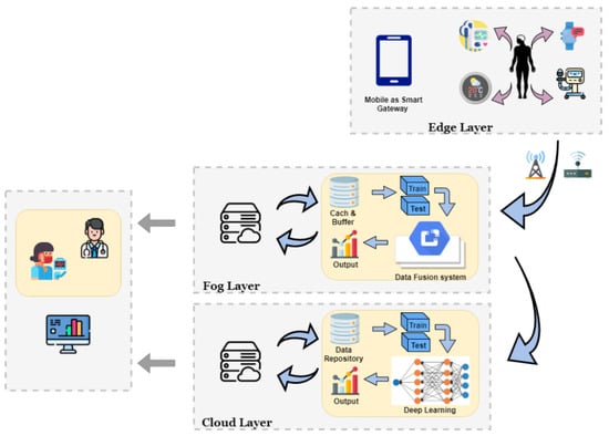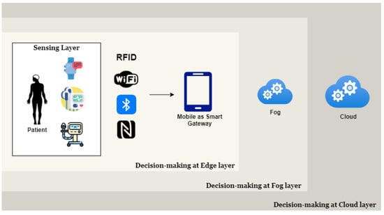 The traditional model of the IoT that generates large amounts of data sent to the information center to process and store is no longer efficient for healthcare systems. Therefore, with limited computation at IoT networks (edge computing), alternative options are sought to deal with the computation challenge. In this era, and add-on layer called fog computing, in association with the cloud layer, aims to drive the sensor’s data processing and storage features close to the data source to ensure a rapid and reliable response to emergency monitoring applications and the safe handling of privacy-sensitive data [4]. In the meantime, the fog computing model of IoT healthcare applications is increasingly being investigated as a means to conduct complex computing and time-sensitive processing locally [5]. Furthermore, above fog computing, when processing Big data, such as providing data to various subscribers, cloud computing becomes an alternative, where data could be collected from different providers and shared across hospitals, physicians, and insurance companies with restricted privacy and sharing policies.