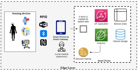 Decision making at the edge layer works as per the Figure 7 below in the proposed model. The advanced smartphones are well-established as they have multiple built-in sensors, such as WiFi, Bluetooth, RFID, NFC, etc. Given the power of smartphones, they can play a vital role as a smart gateway (smart edge computing) for IoT systems. All IoT devices collect the patient’s medical information or any other type of information that is specific to the patient and it is pushed to the smart gateway (smart phone) acting as the edge layer.