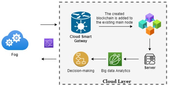 This is the upper layer, where the Internet of Things is supplemented by the processing and storage capabilities of the cloud. Figure 9 above represents the scheme in which decision making is done at Cloud Level. Reference [26] suggested a novel algorithm for the decision making with neural network and deep learning. Reference [28] suggested the design of a Smart and Secured Healthcare Service blockchain with the use of Deep Learning. Similar algorithm can be applied the module here as well. In the model proposed, the cloud central IoT is responsible for receiving the data from the edge gateway devices. These devices convert the data from sensors and IoMT devices from a raw format to the cloud central hub generic data format. The database of the information resides in the cloud where the information is processed for the decision making. The artificial intelligence service for image processing or data analytics in the smart cloud gateway assured that the data is analyzed and the final commit at the server takes place. This database receives all the information from the fog gateway devices and, after the decision making is completed, then the final data-block is synchronized at the blockchain level.