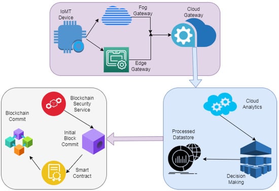 The proposed methodology that is used in this manuscript is the structured analysis and design technique. The hierarchy design is explained step-by-step in an incremental fashion. The initial stage for designing the system begin from the collection of data from healthcare workers or hospitals and trees with the help of IoMT devices. Once the data are retrieved, that information is flown from the devices to the internet with the help of edge and fog Gateway devices. This devices at the second stage sends some information to the cloud network. The second stage of processing in the proposed methodology comprises yet another system function that relates to decision making based on cloud analytics. The third step, which is responsible for the blockchain and smart contract, is also designed. The methodology used in this is case helpful for the upgrade of a system and identifying its shortcomings.