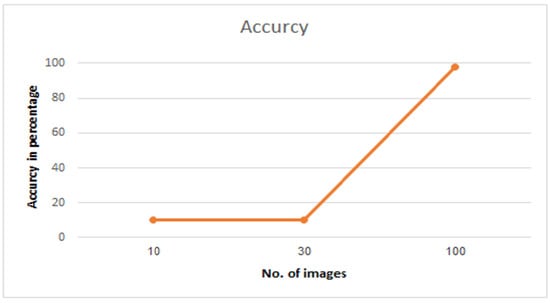 After the analysis is completed for all the images in the data-set (Figure 13), it is identified that 10 and 30 images give the maximum evaluation metrics values. This observation is important, as it can predict the nature of a disease that a patient might be suffering from. In this case, the accuracy increases after 30 images in the analysis engine. There is no ‘Image Generator or Augmentation’ applied because we have only a few images’ data. The model is already trained and we used the previously trained models during the testing of models, such that when we pass any image for the testing, first it calculates the feature vector and then compares it with the trained models. We used the CNN model including the VGG16 flavor with deep learning libraries such as TensorFlow and Keras. We did not use the Fastai.vision library here because it takes a very large number of computations and it is useful for large amounts of data, and for training purposes only. Figure 14 below shows that larger data-set or observations from the IoMT devices results in better accuracy.