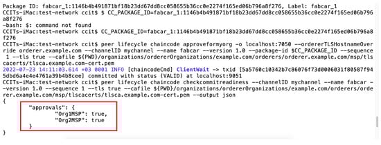 In the experimental setup, we have deployed our own hyperledger fabric at the local network. The docker images from the Figure 16 below shows that, inside the test network, two organizations are trying to communicate with each other. These organizations can vary depending upon the nature of blockchain established between them. The hyperledger fabric makes it possible for the two peers to accept smart contract between them. When the analyzed data block is finally ready to be deployed in the blockchain network, smart contract is floated in the docker images for both organizations to accept. As soon as the organization accepts the smart contract, the data block comprising the final analytic of the patient history and information is submitted on the blockchain network to all the nodes.