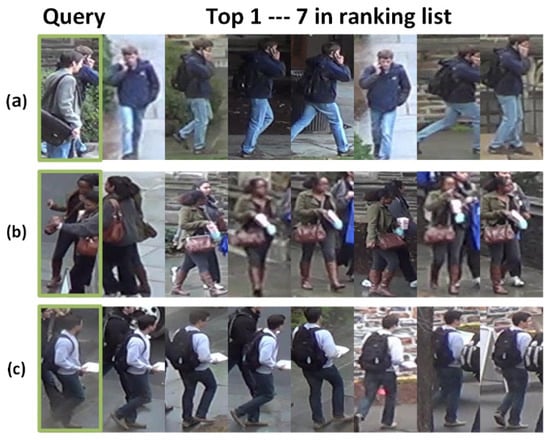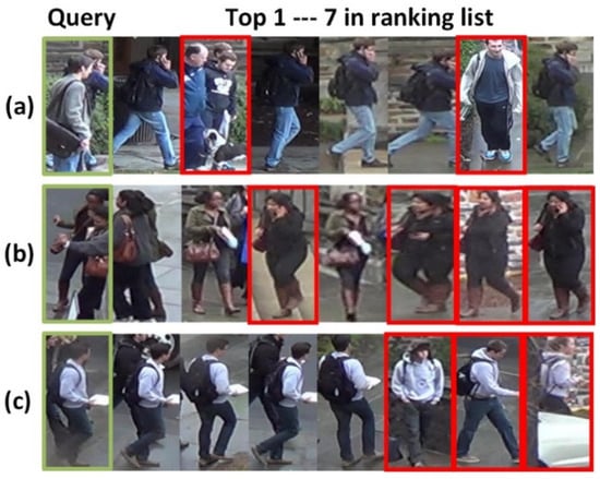 Ranking performance of BagTricks on DukeMTMC-ReID. The green box represents the correct target pedestrian image retrieval, and the red box represents the wrong retrieval results. (a) Sample 1; (b) Sample 2; (c) Sample 3.