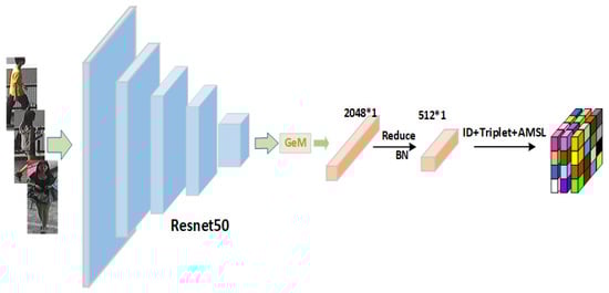 AML baseline is an uncomplicated but effective Re-ID network. At present, most researchers choose the resnet-50 [] as the backbone model; this is because the backbone network can effectively prevent gradient explosion and make the network converge rapidly. The baseline we designed still uses the resnet-50 backbone network, which is convenient for comparison with other advanced algorithms. Figure 2 shows the main frame of the baseline presented in this manuscript. There are four key parts in the baseline: ResNet-50, GeM, BN layers, and ID + Triplet + AMSL (loss function part).