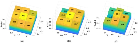 Coefficient and : In the loss function part, it is found that different combinations of coefficients have a great influence on the experimental results. Therefore, we need to adjust the coefficient of triplet loss and AML loss appropriately. We set the initial values to = 0.5 and = 0.5 and obtain the final parameter values by using this control variable method [].