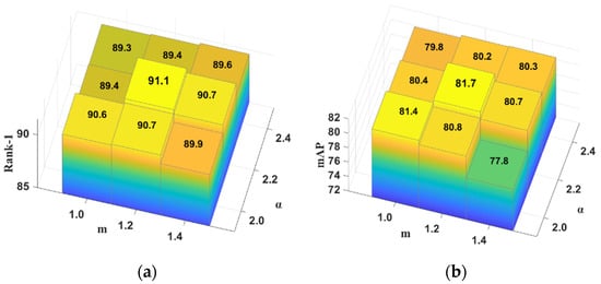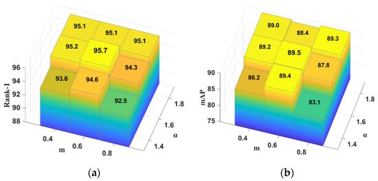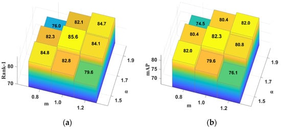 It is important to note that our baseline has the characteristics of low complexity and short training time. This paper analyzes the parameters of the loss function section. Because there are four parameters, this paper adopts the following strategy. Firstly, we use ID loss and the AMSL loss function to determine the appropriate values of α and m through comparative experiments. Then we use the triplet loss function and analyze and . Finally, this paper combines the triplet loss and AMS loss to analyze α and m again.