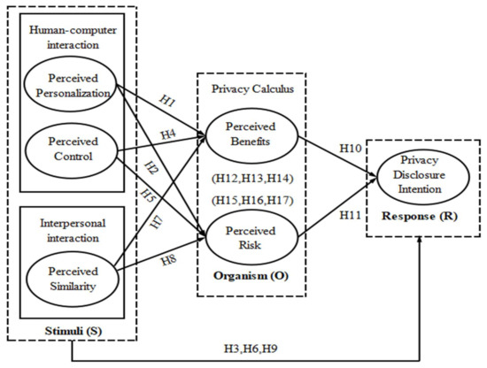Since interactivity is a key feature of social media, Jiang et al. [11] observed that even though users realize the risks involved in synchronous online social interactions, the users still disclose their abundant personal information. Additionally, they find that the perception of anonymity, media richness, and intrusiveness in online social interactions will affect users’ privacy trade-off, thus affecting privacy disclosure. Subsequently, some scholars believe that interaction plays a significant role in determining users’ manners and behaviors, the relationships show positive or inverted U-shaped and the main influencing factors include perceived personalization and perceived control [12,13]. Kang and Namkung [14] revealed that perceived personalization has positive effects on perceived benefits and perceived risks involved in privacy disclosure. Princi and Kramer [15] believed that when users perceive control, they will see less risks and more gains, thus increasing their intention to disclose privacy. In addition, some scholars have proposed that perceived similarity in interpersonal interaction has an indirect positive impact on users’ behavioral intention in the social network context [16,17]. There are many studies on the influence of interaction on user behavior, but a very small number of them have considered the effect of interactivity on privacy disclosure intention under the effect of privacy calculus. Through frequent interaction on social media platforms, users can establish close social network connections, so as to weigh the perceived benefits and risks after interaction and make privacy disclosure decisions. Based on this, from the perspective of interaction, this paper draws on the SOR theory model and innovatively combines human–computer interaction and interpersonal interaction as external environmental stimuli, and takes privacy calculus as an internal organism to explore the influence mechanism of interaction under the intermediary effect of privacy calculus on social media users’ intention to disclose privacy.