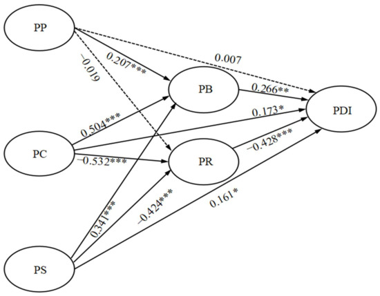 As illustrated in Figure 2 and Table 4, the testing results showed that 11 hypotheses (H1, H4–H11) were supported. Significantly, PP (H1: β = 0.207, p < 0.001 had a significant effect on PDI, supporting H1. Additionally, PC (H4: β = 0.504, p < 0.001; H5: β = −0.532, p < 0.001; H6: β = −0.173, p < 0.05) had significant effects on PB, PR, and PDI, respectively, the hypotheses of H4–H6 were supported. In addition, PS had significant effect on PB, PR, and PDI, respectively. Therefore, H7–H9 was supported. Furthermore, the effect of PB and PR on PDI was 1% and 0.1%, respectively, supporting the hypothesis of H10 and H11. However, PP had no significant effect on PR and PDI. Therefore, H1b and H1c were not supported.