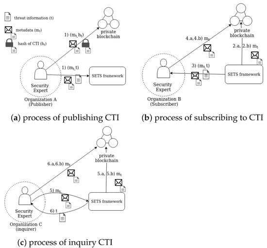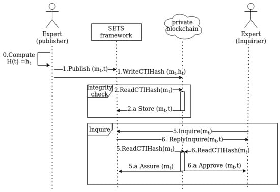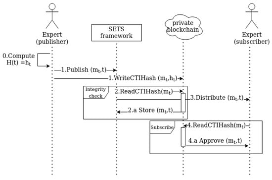 In the developed solution, publishing threat information by an expert triggers the automated procedure wherein a message is relayed to SETS and its hash is written to the blockchain. Next, SETS distributes the data to the subscribed parties and, eventually, the integrity of the message is verified by both SETS and potential consumers. All the above transactions are carried out without any human intervention. Thereby, the solicited or unsolicited human errors would be eliminated, leading to a higher degree of reliability and security associated with threat sharing process.
